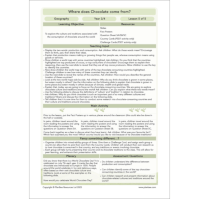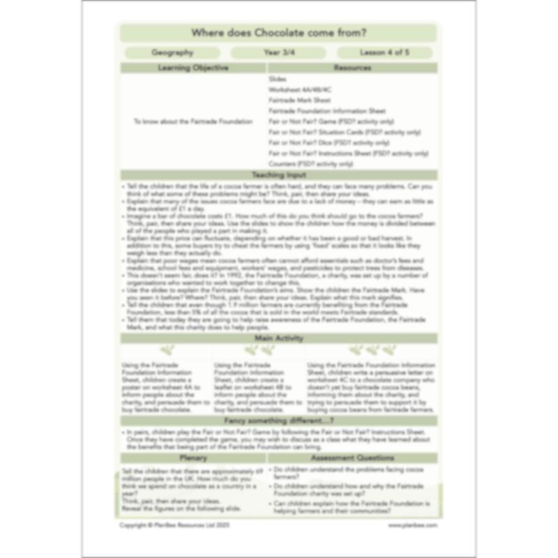 This Cocoa Farmers lesson provides all the resources you need to deliver this lesson, including an easy-to-follow lesson plan, a PDF slideshow, differentiated activity ideas and a range of printable teaching resources.