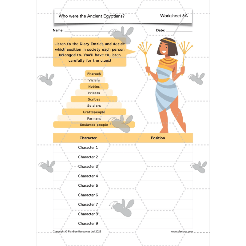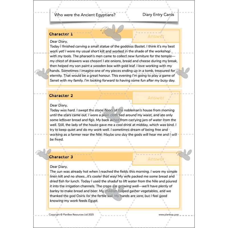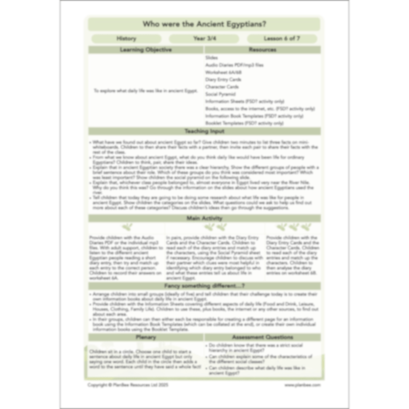 With opportunities for discussion and enquiry, children are encouraged to generate their own research questions and explore aspects of daily life in ancient Egypt using books, provided information sheets or the internet. There is also the chance to explore what daily life was like through fictionalised diary entries from each group of people in the social pyramid.