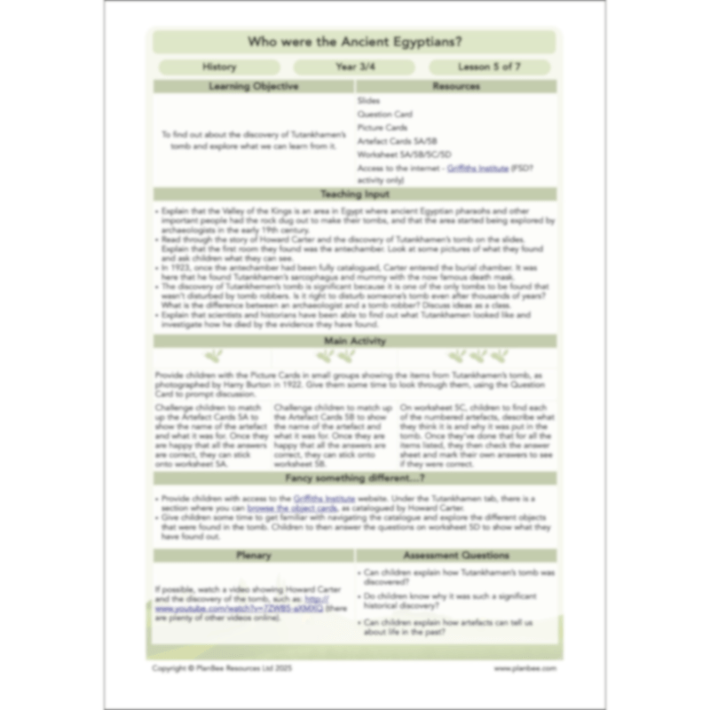 This fascinating lesson explores the story behind one of the most significant archaeological finds of all time. Through engaging slides and activities, children will learn about Carter’s years of searching, the moment the tomb was uncovered, and why this discovery was so important for understanding ancient Egypt.