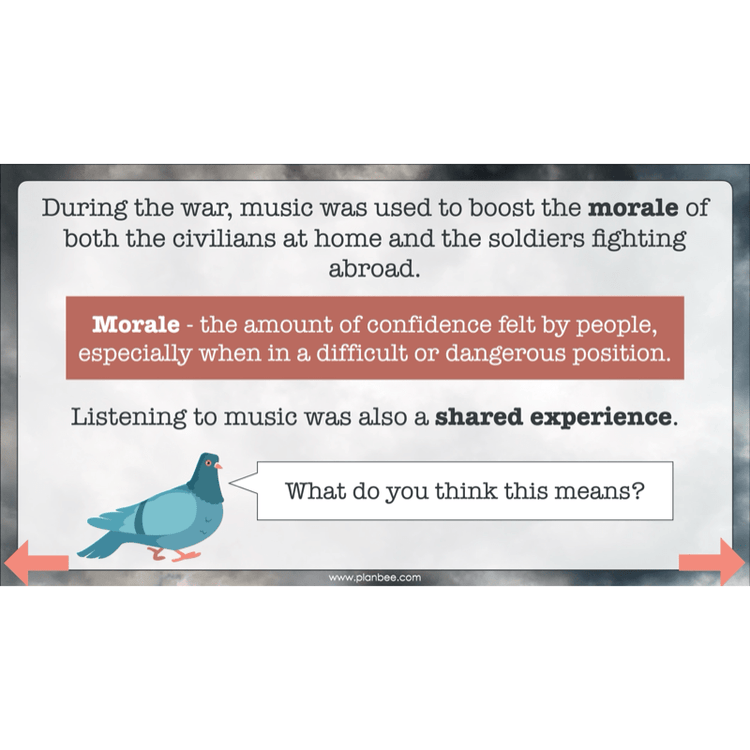 In this lesson, children will reflect on how music was used during the war to keep up morale for the soldiers and for the people at home.