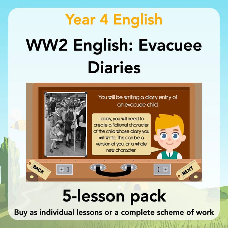 This five-lesson World War 2 evacuee diary entries planning pack will guide your Year 4 class in creating a 1939 evacuee character and writing from their perspective in WW2 diary entries.