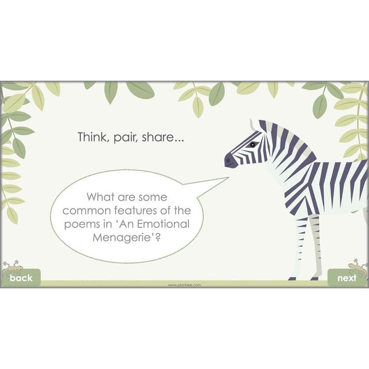 Using all their hard work throughout the previous lessons, your class will finally draft their own poem to fit into the emotional menagerie. They will be challenged to mimic all the structural features of the existing poems so that their poem could easily replace one of the poems in the original, or you could create your own class 'Emotional Menagerie'.