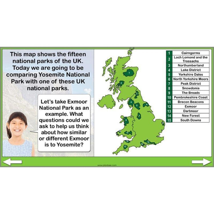 Bringing your pupils closer to home, this lesson gives them the opportunity to compare Yosemite National Park to a national park within the UK. Your class will identify where each of the UK's national parks are before thinking of different questions they could explore to help them compare a park in the UK with Yosemite. There is then the chance to carry out some research of their own as they find out the answers to their questions.